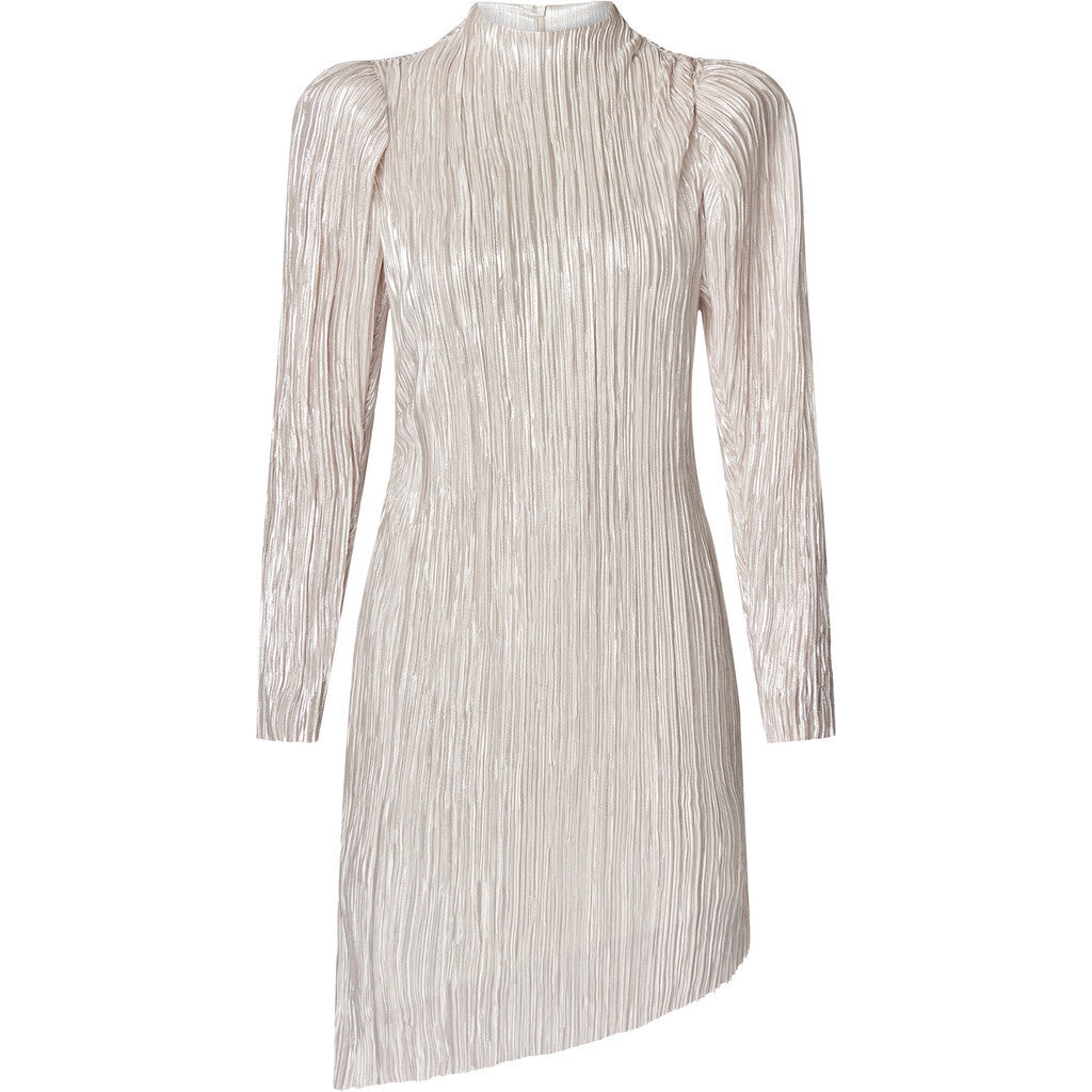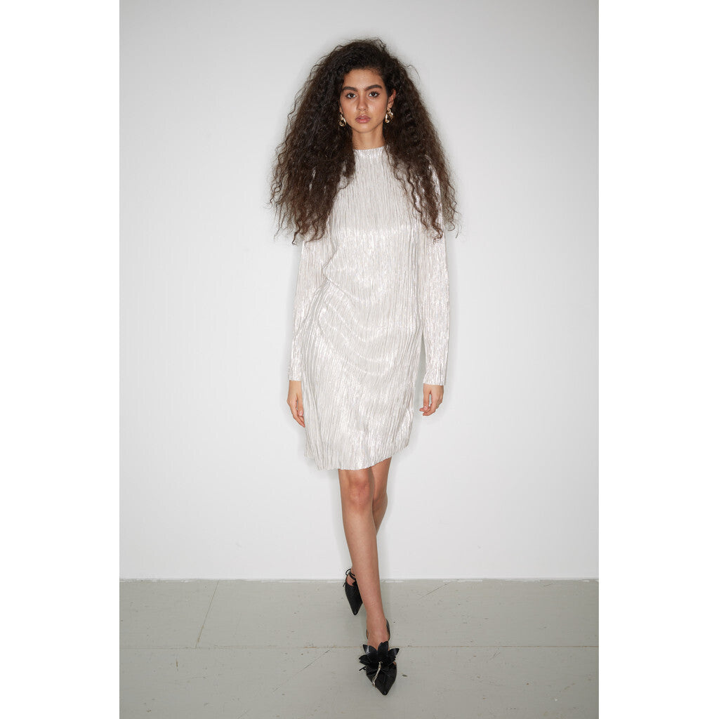 • Fallegur sérsniðinn kjóll í silvermetal mjuku efni. Kjóllinn er hannaður með falnum rennilás að aftan, ermum og í teygju efni sem gerir auðvelt að hreyfa sig, Fullkomið fyrir hátíðarefni.