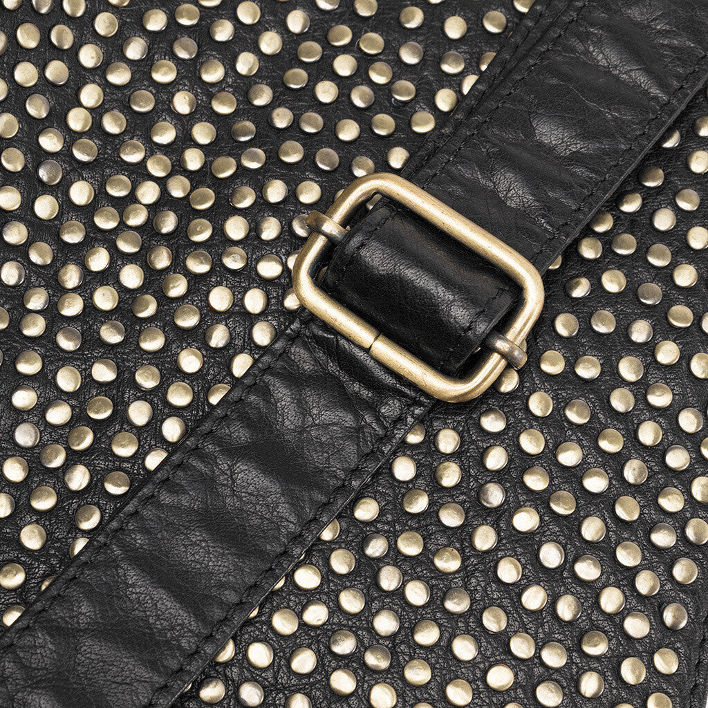 - Crossbody taska í fallegum, ljúffengum og mjúkum leðurgæði. Taskan er með auka smáatriðum hvað varðar mörg hnoð, sem gefur flott og hrátt útlit. Það lokast að ofan með rennilás.