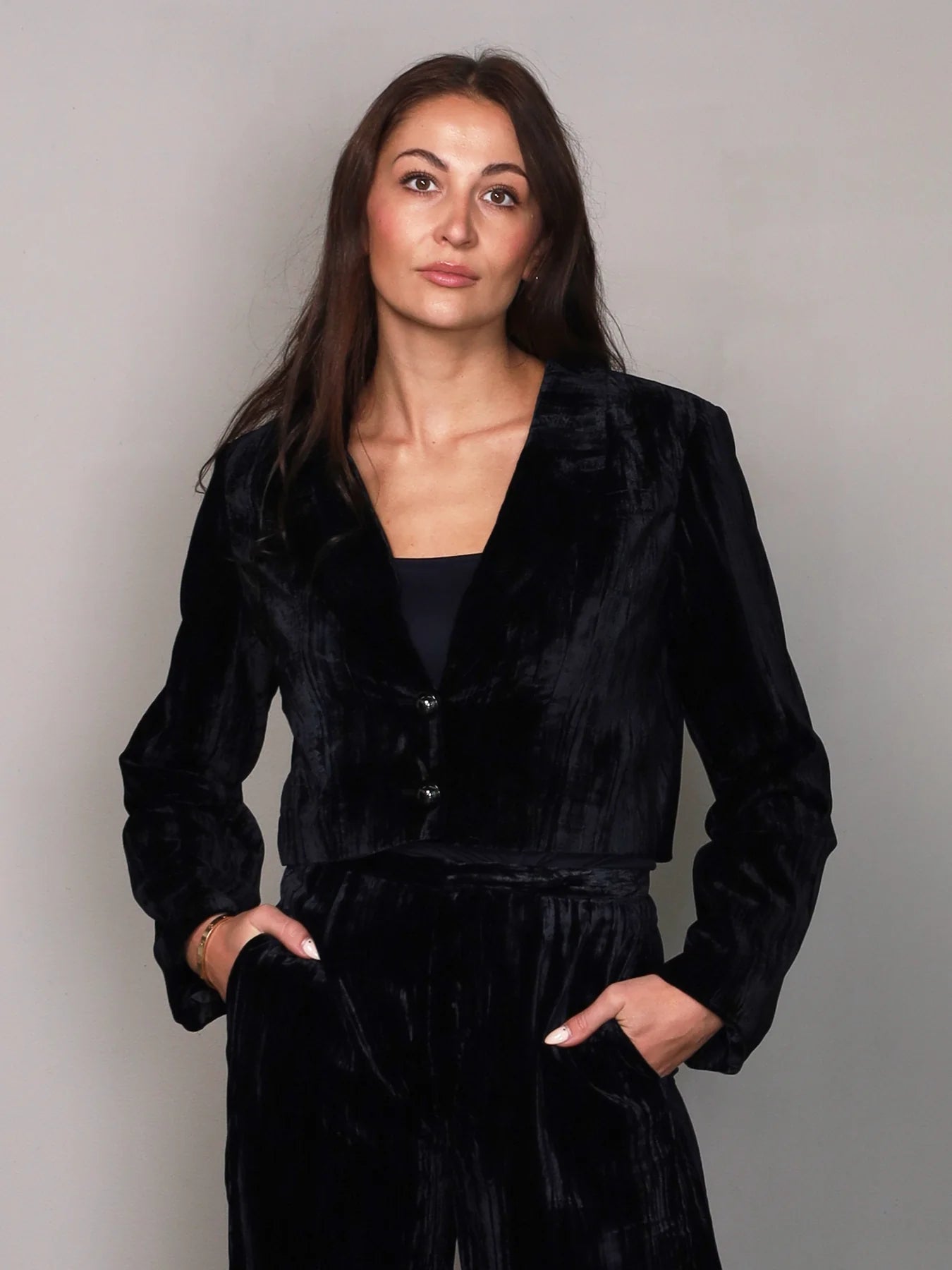 Uppfærðu fataskápinn þinn með þessum fallega uppskorna blazer í velúrgæðum. Stutt lengdin bætir við nútímalegu ívafi, á meðan mjúkt, glansandi velúrefnið bætir lúxus tilfinningu við útlitið þitt. Með klassískum hnöppum að framan og sérsniðnu sniði er þessi blazer fullkominn fyrir bæði dag og kvöld. Stílaðu það með háum mittisbuxum eða yfir kjól til að búa til glæsilega og fágaða skuggamynd.