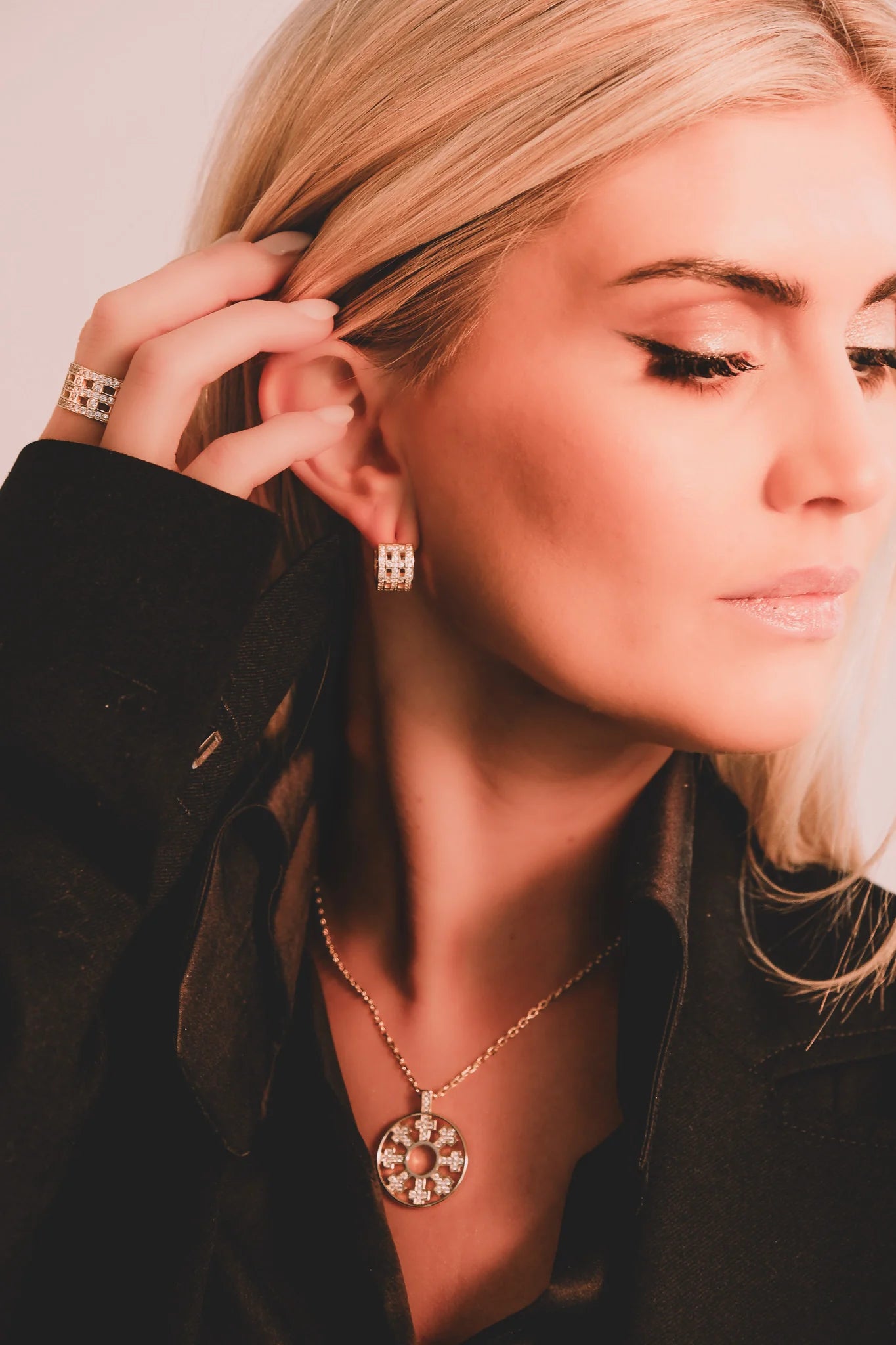 Glæsilegir hring lokkar með krossum allan hringinn og skreyttir með sirkon steinum. Tímalaus hönnun sem hentar við öll tækifæri.