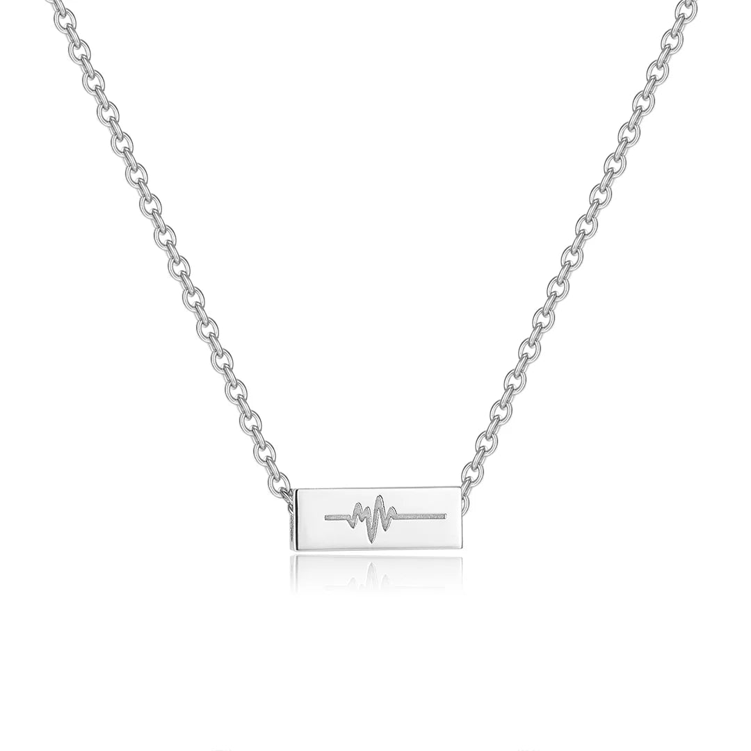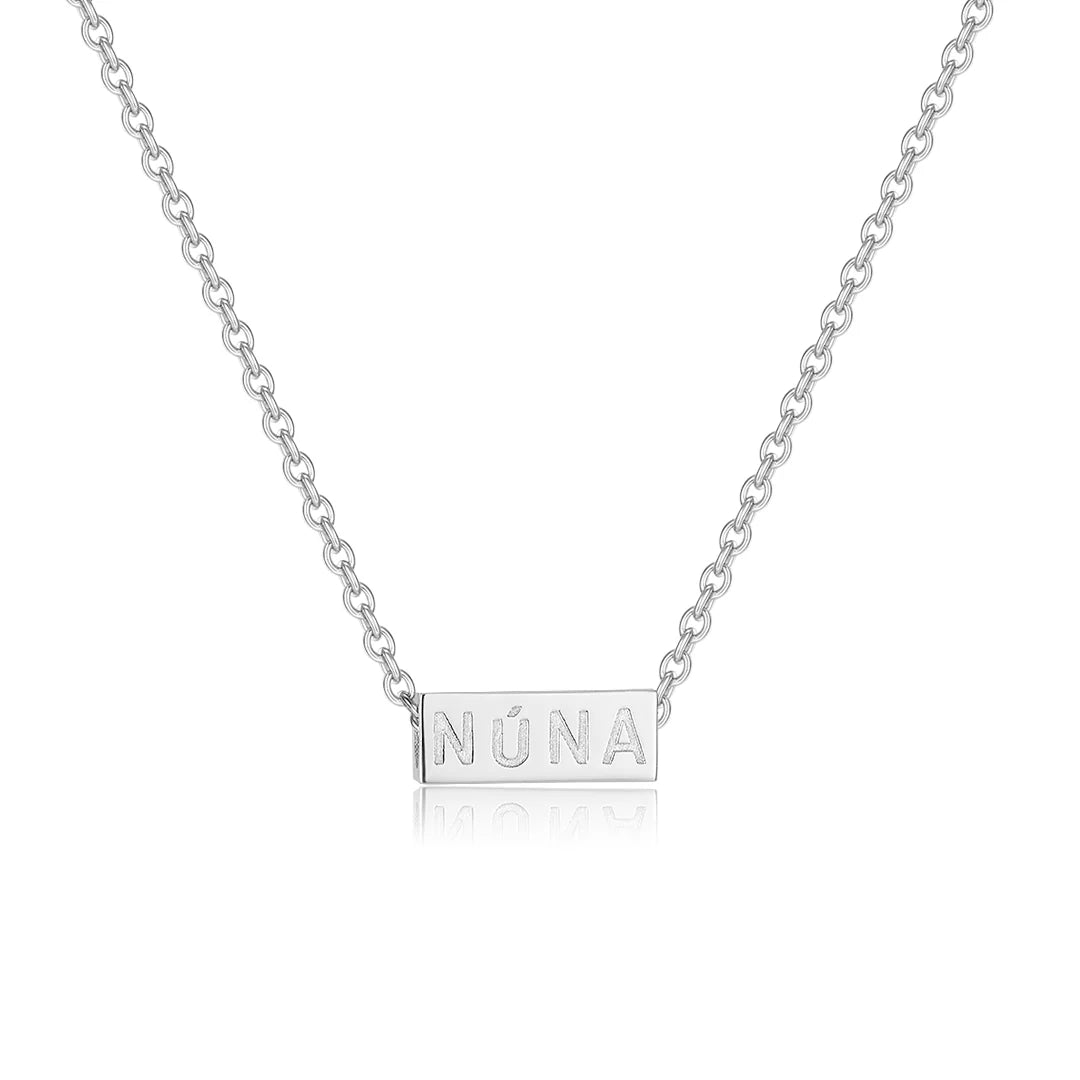Hálsmenið er 1,5 x 0,5 cm og kemur með bæði sand litaðri vegan leðuról og silfur keðju sem eru 42cm með 8cm framlengingu.