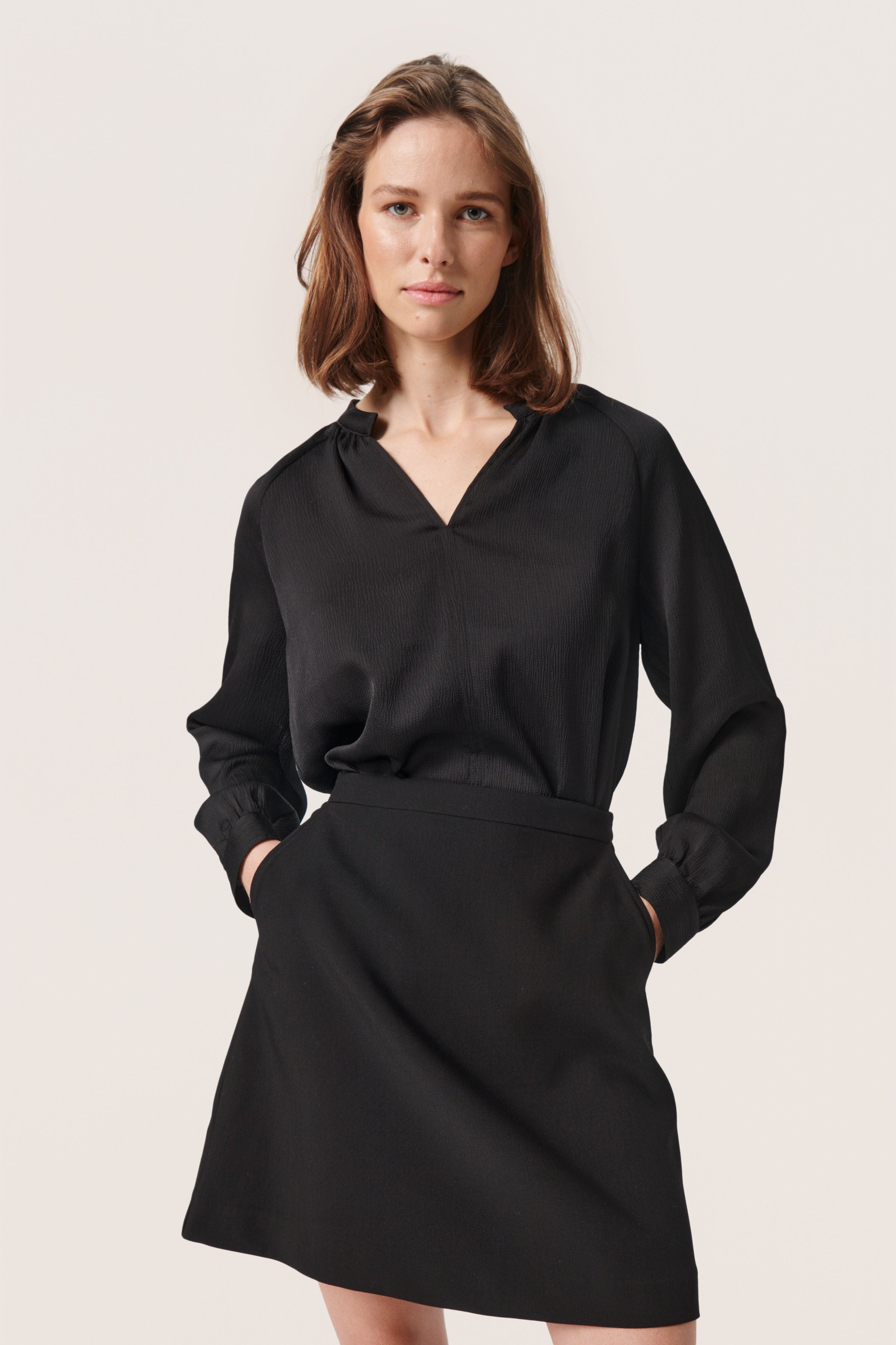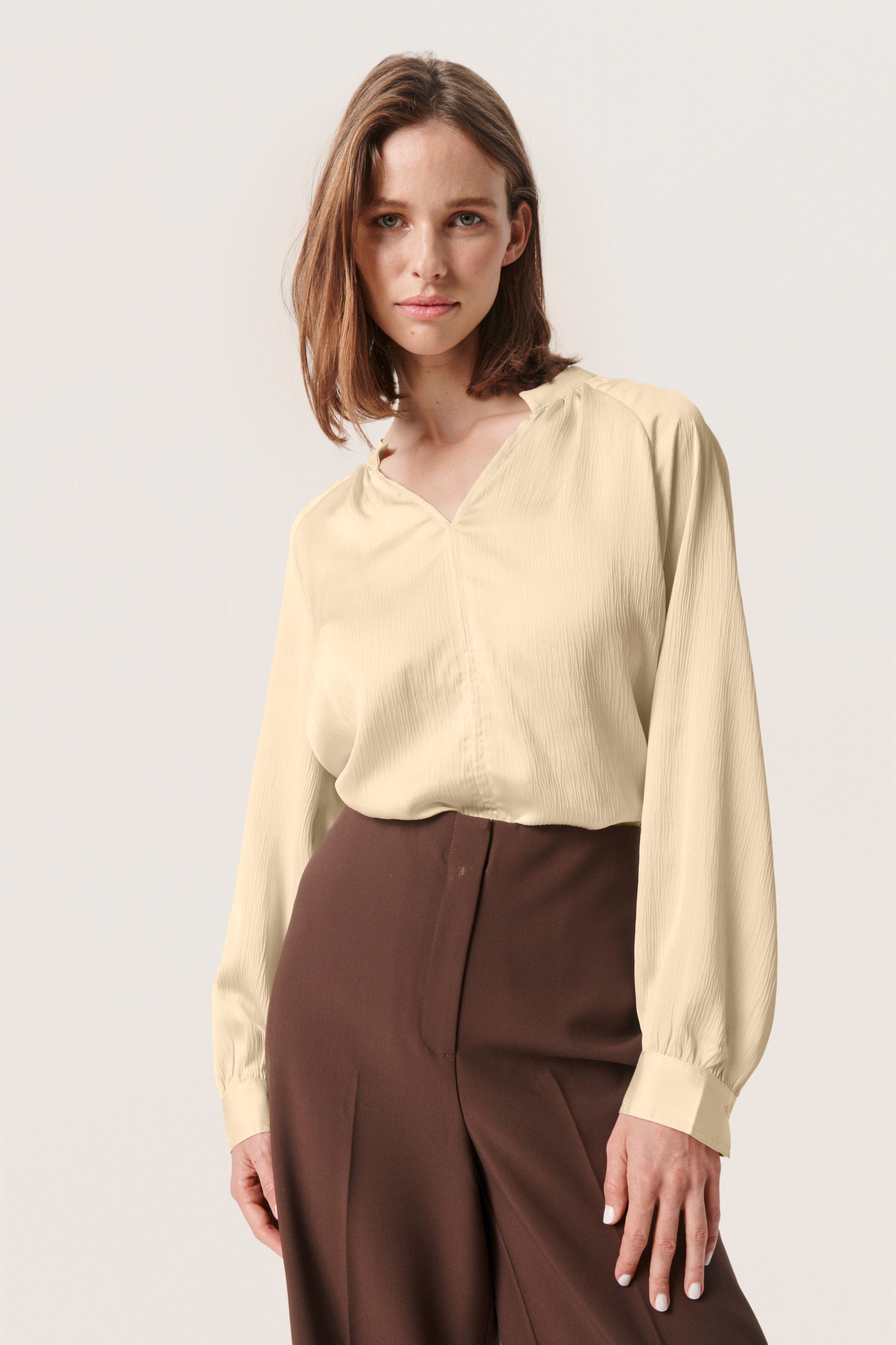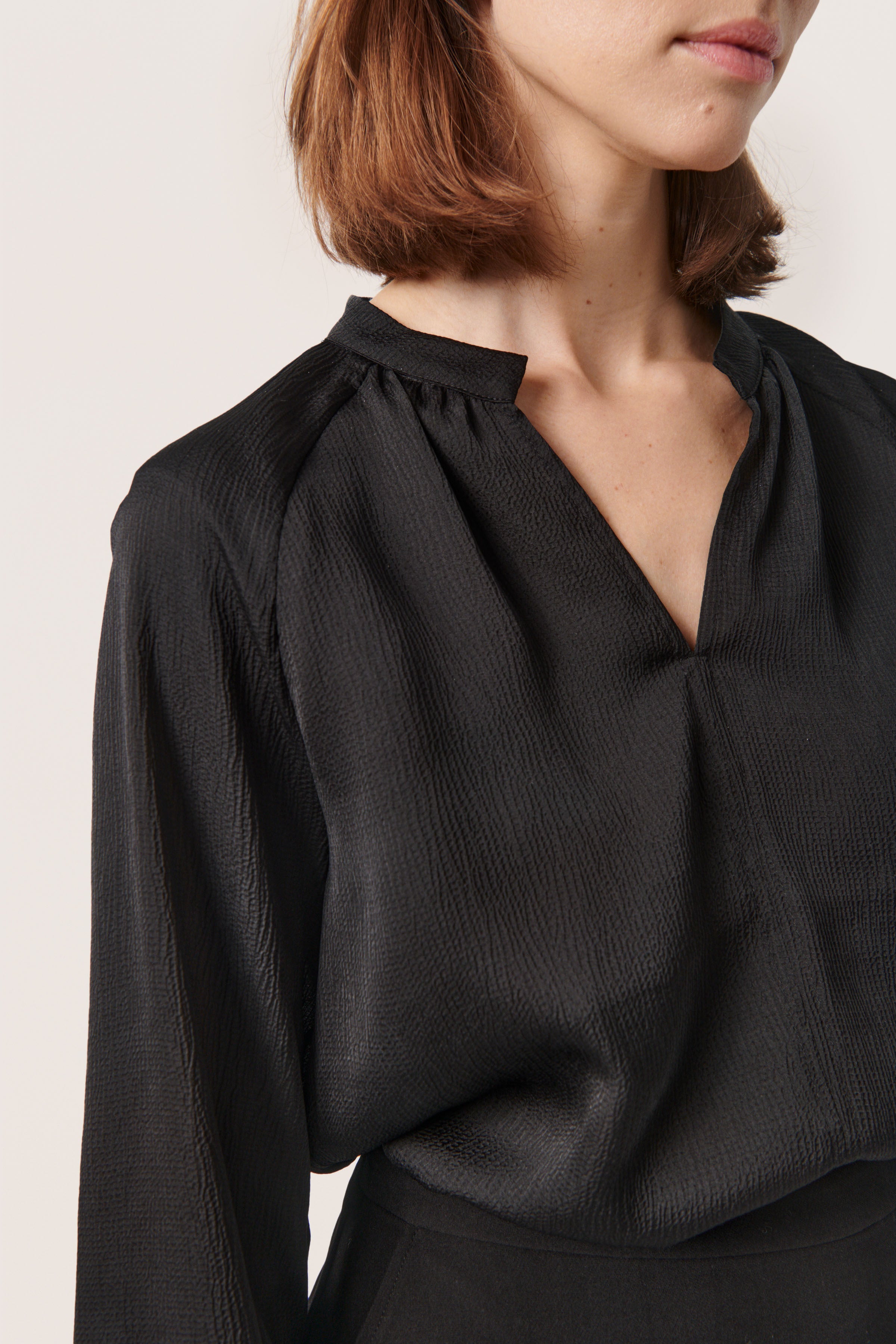 • kvennlegt snið í þessum fallega sateen efni enda topp seller frá þeim kemur i nokkrum tilum og með v-halsmali löngum ermum tilvalið spari eða hversdags við dragt eða gallabuxur