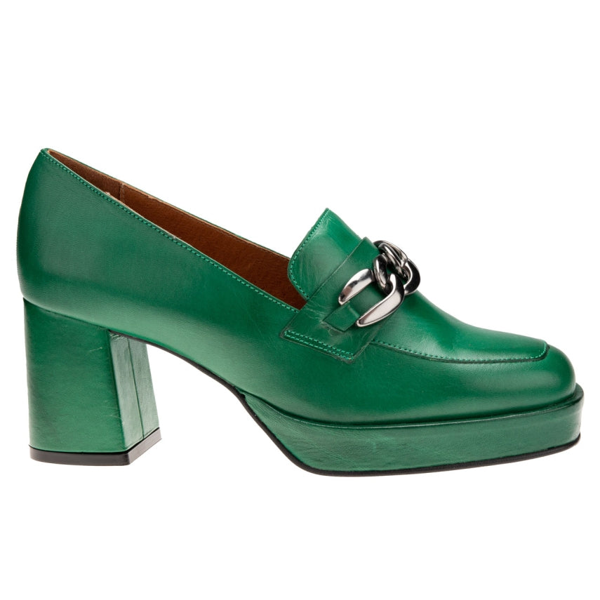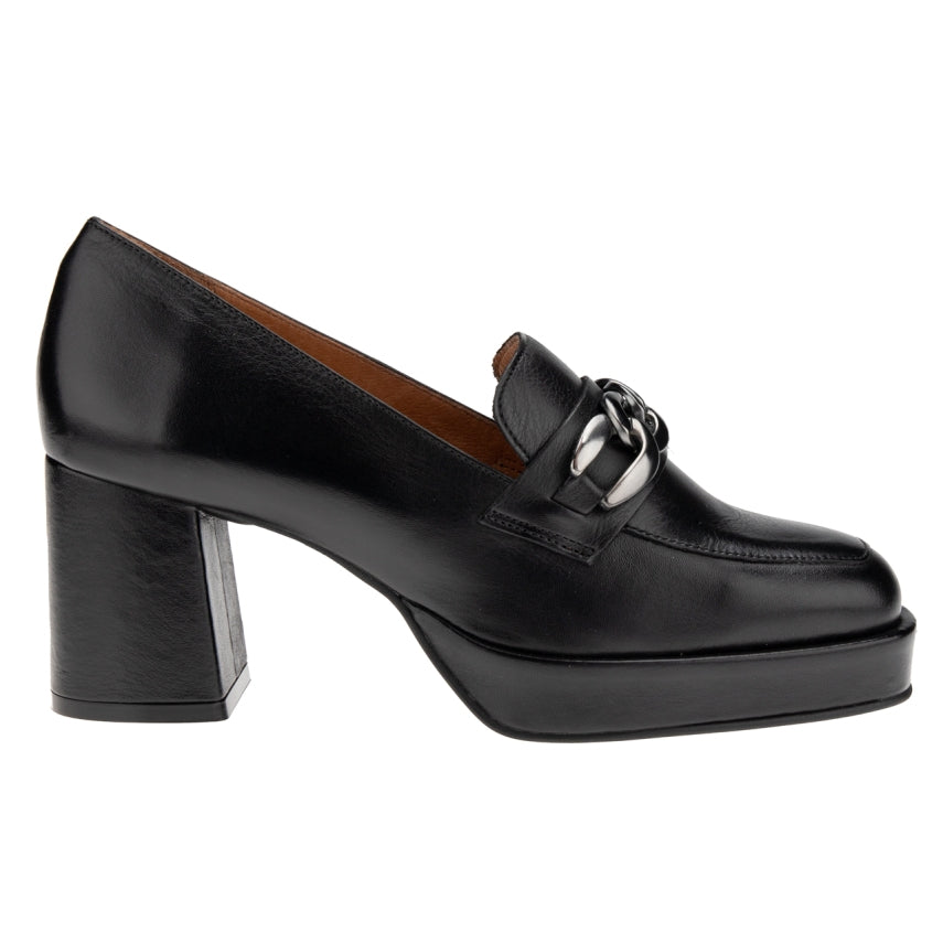 • Six Mix hælaskór Glæsilegir hælaskór í mokkasínustíl. Chunky keðja til skrauts yfir ristina. Framleiddir úr leðri. Hællinn er 8 cm hár. 2 cm platform.
