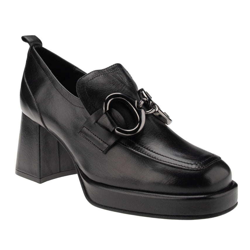 • 100% Leður. Leður með lakkáferð. Stór keðja til skrauts á rist. 6 cm hár kubbahæll. 1,5 cm platform.
